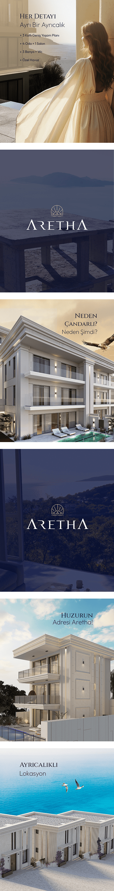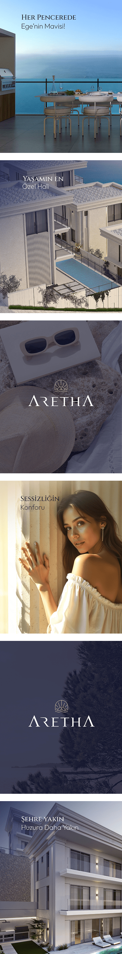 Aretha Signature'ın mimari dili, doğal konumu ve yaşam felsefesini merkeze alan bir marka kimliği oluşturduk. Renk paletinden tipografiye, logo ve kurumsal materyal tasarımlarına kadar tüm marka öğelerinde estetik, doğallık ve rafine bir çizgiyle tutarlı bir görsel dünya kuruyoruz.