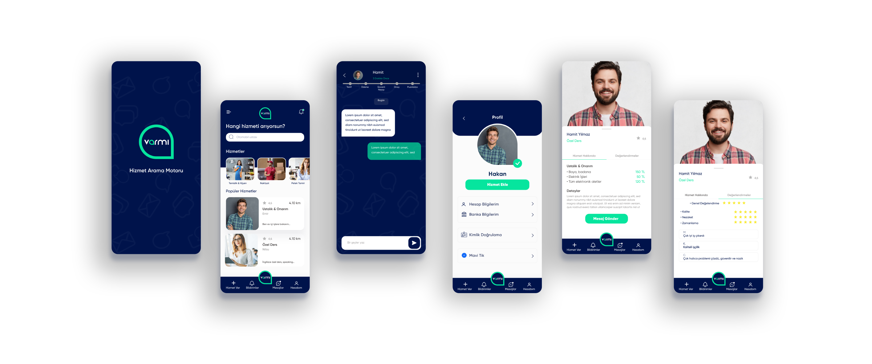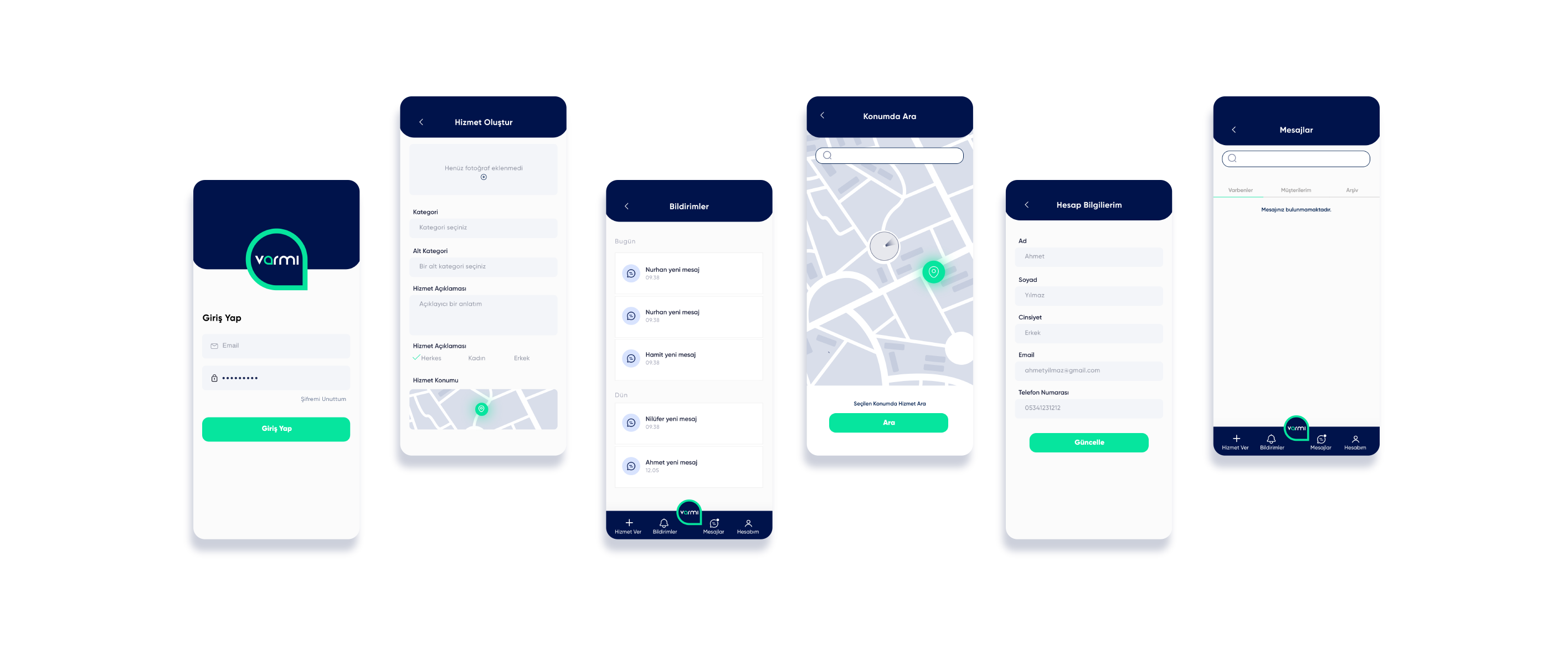 VARMI mobil uygulaması için kullanıcı deneyimini merkeze alan, sade ve işlevsel bir arayüz tasarladık. Hizmet arayan kullanıcıların ihtiyaçlarına hızlıca ulaşabildiği, hizmet verenlerin ise kolayca yönetim yapabildiği bir yapı oluşturarak, uygulamanın erişilebilirliğini ve etkileşimini artırdık.